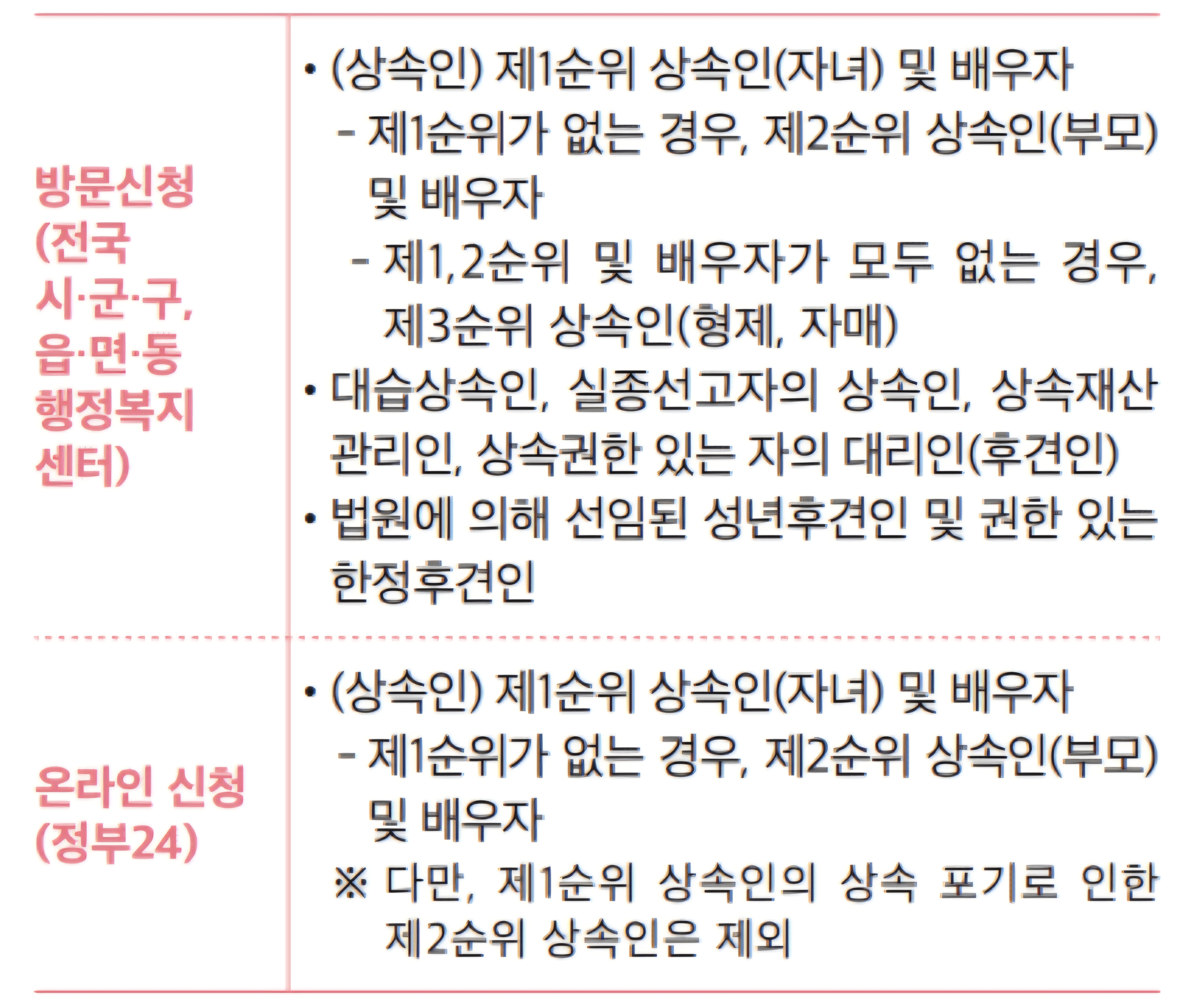 안심상속 서비스는 **사망자의 법정상속인(배우자, 자녀, 부모 등)**이라면 누구나 신청할 수 있습니다. 가장 많이 이용되는 방식은 주민센터 방문 신청이며, 신분증만 가져가면 담당자가 관계 확인 후 즉시 접수해 줍니다. 또한 정부24에서도 온라인 신청이 가능해 바쁜 유족도 편리하게 이용할 수 있습니다. 사망신고를 할 때 “안심상속 서비스도 함께 신청하겠습니다”라고 말하면 별도 신청서를 작성할 필요 없이 동시에 접수되는 점도 큰 장점입니다. 다만, 형제·자매는 법정상속 순위에 해당하지 않는 경우가 많아 신청이 제한될 수 있으니 유의해야 합니다.