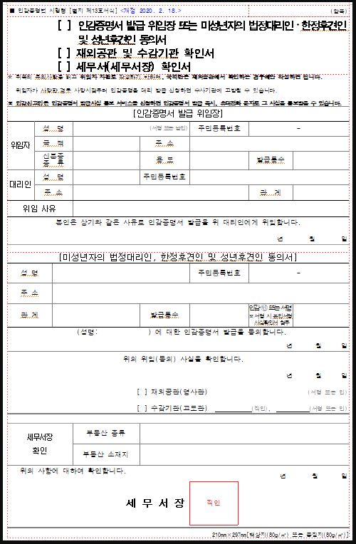 - 준비물: 위임장(위임인의 인감날인 필수), 위임인의 신분증, 대리인의 신분증